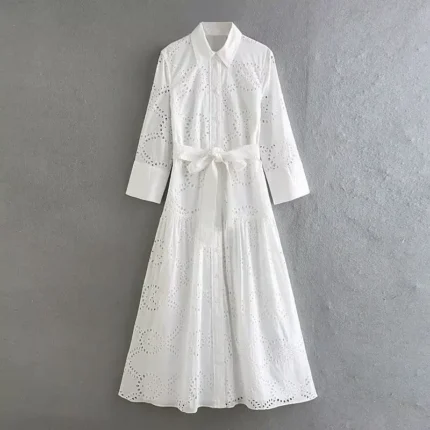 فستان أبيض مطرز بحزام وأكمام طويلة